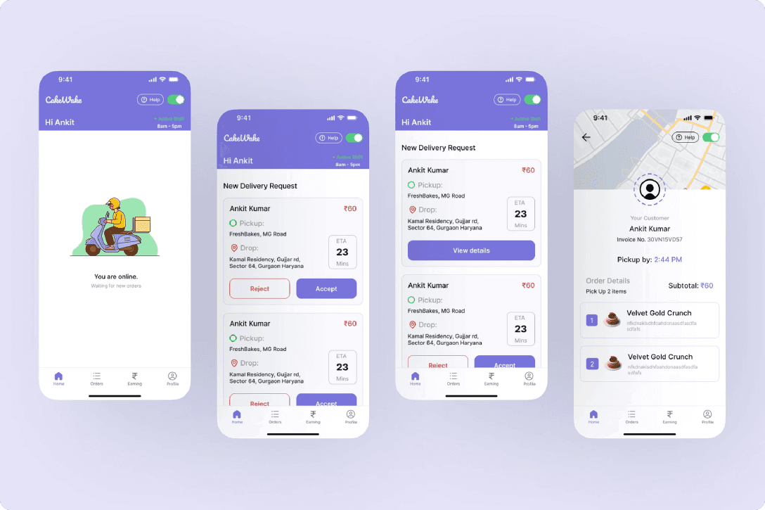 The Delivery Partner App was designed to help delivery agents manage cake deliveries with maximum efficiency and minimum confusion. The app focused on clarity, simplicity, and real-time status updates to support fast-moving on-ground operations.