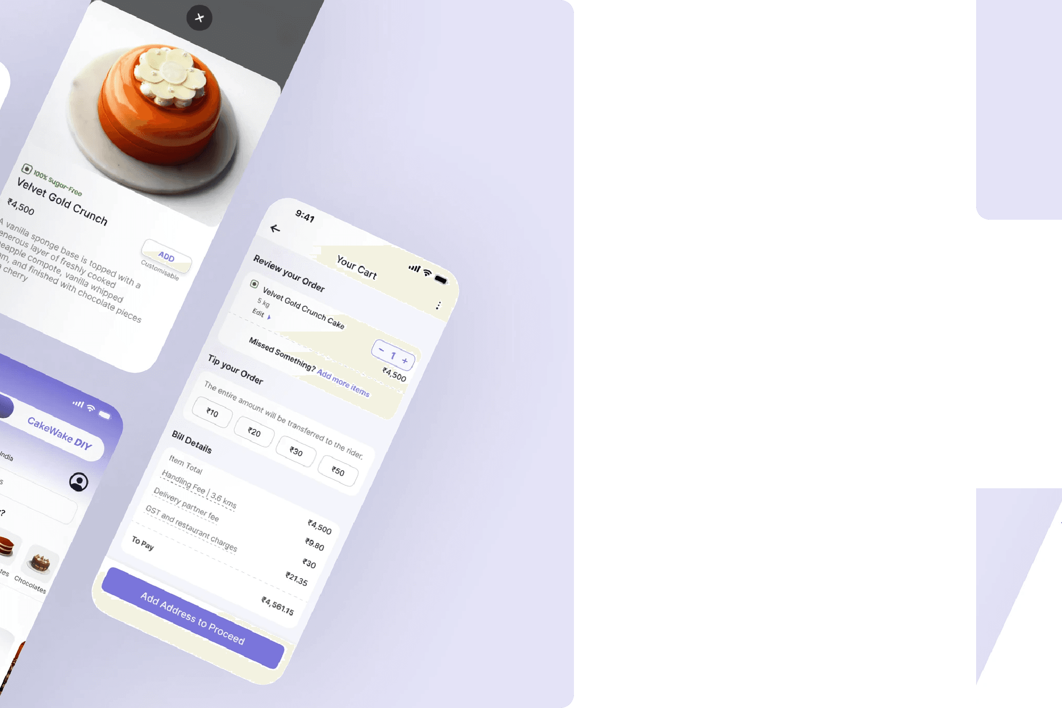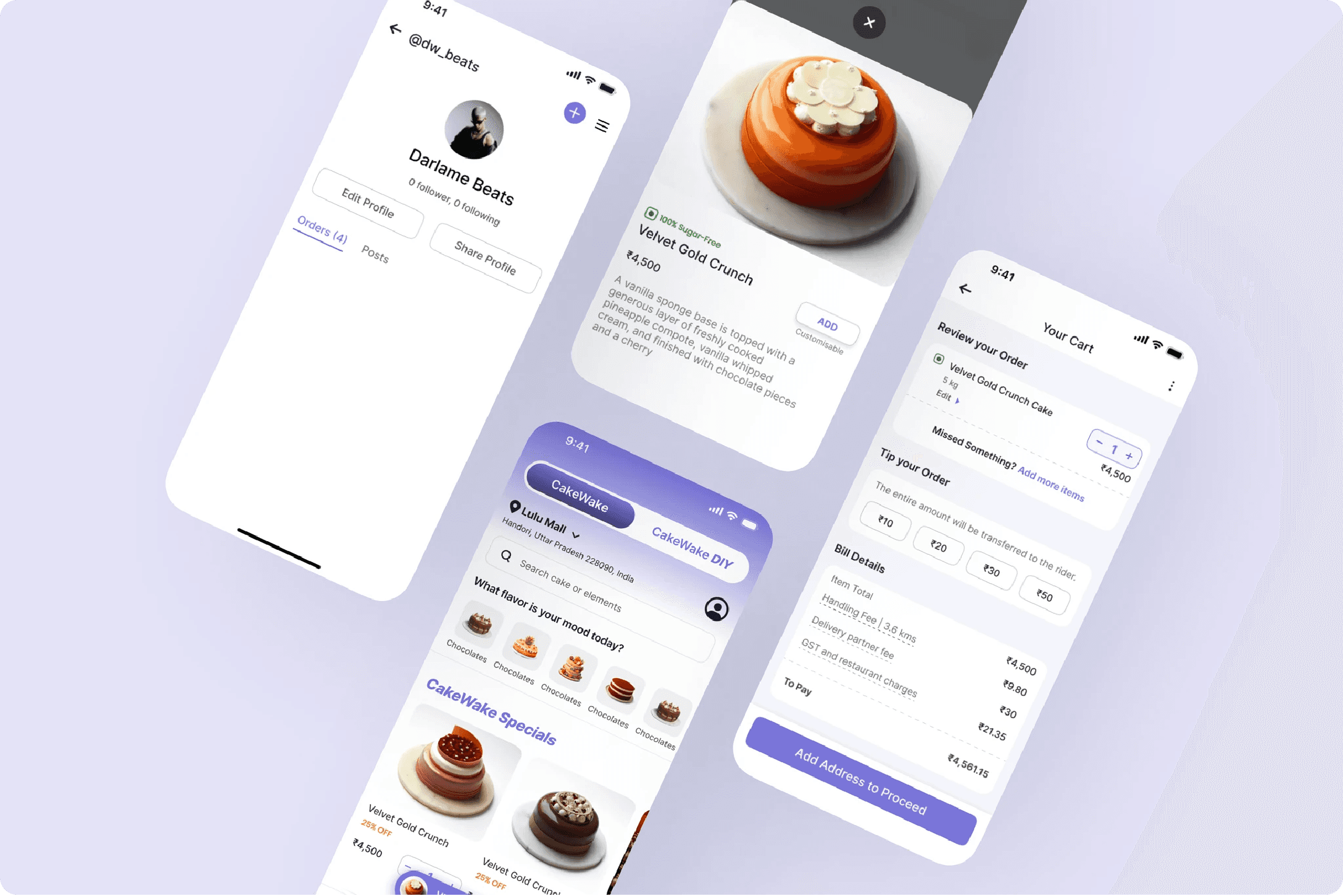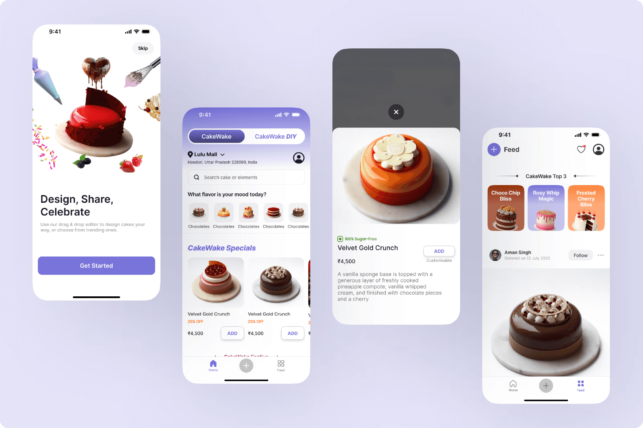 User App: Designed intuitive, visually appealing, and easy-to-navigate screens for customers to browse, customize, and order cakes.
