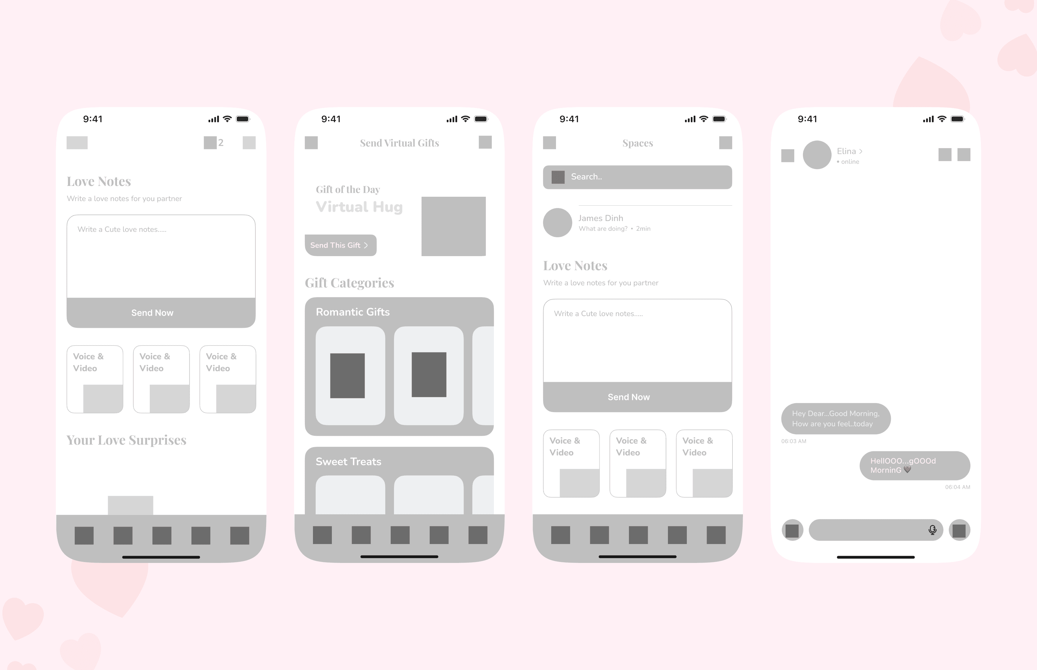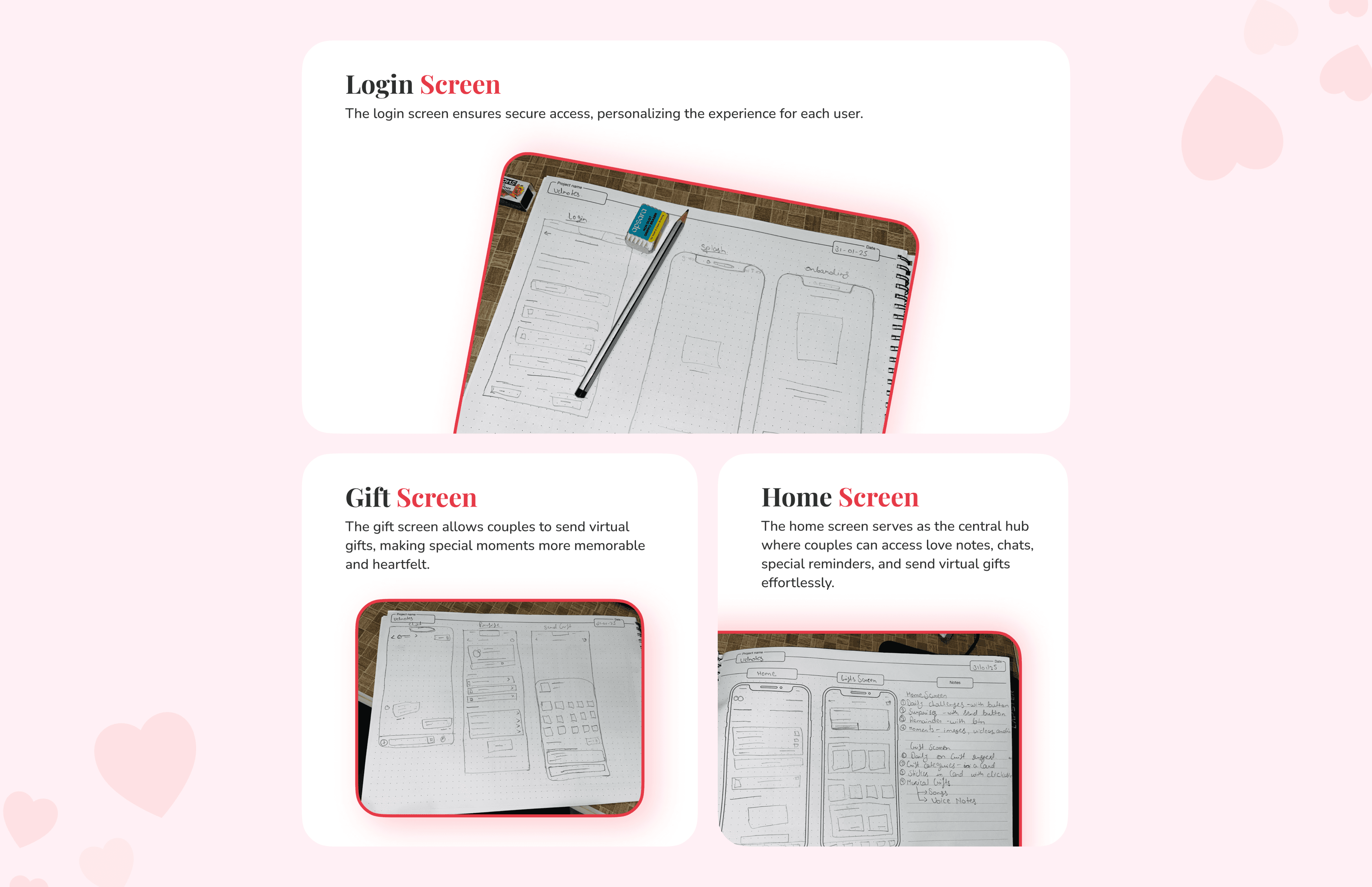 Early ideation sketches focused on addressing core user needs: personalized love notes, gift sharing, and seamless partner connection.