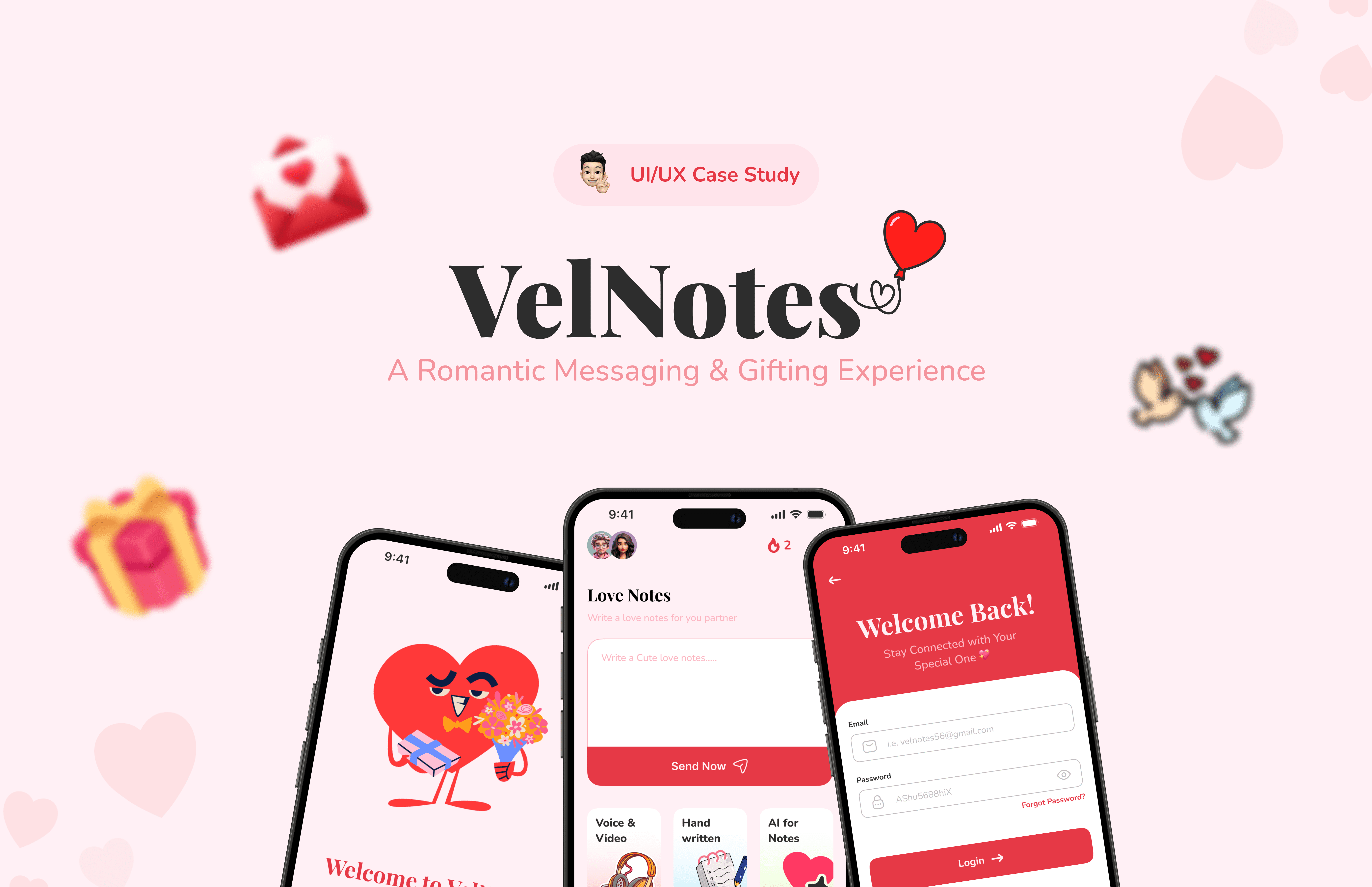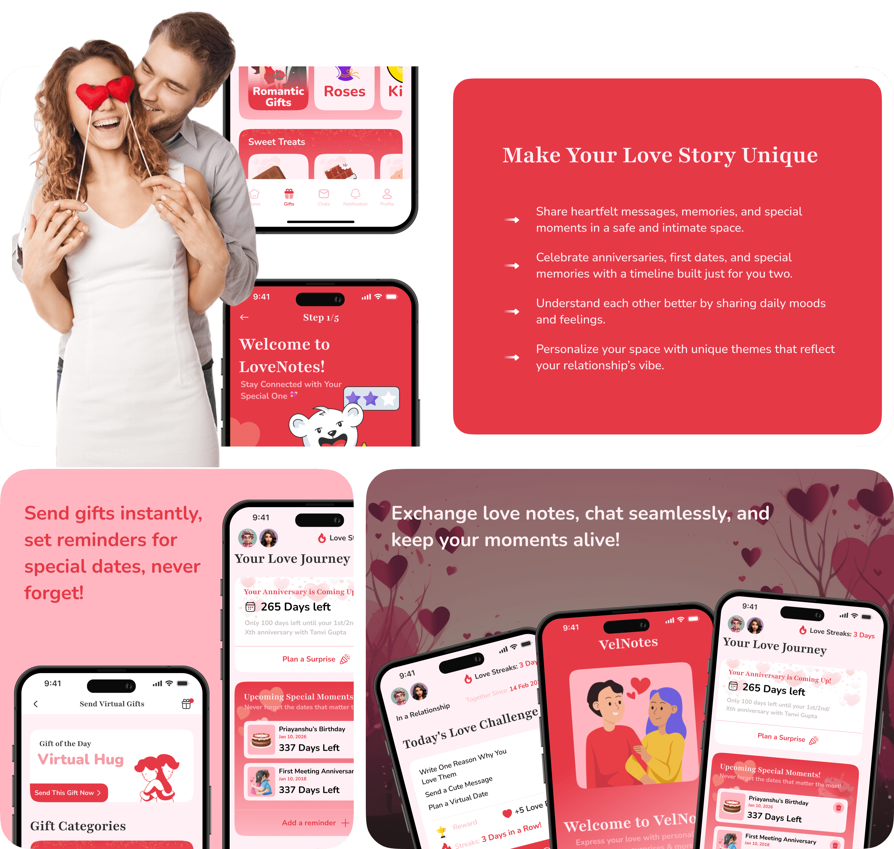 VelNotes is a personalized app for coulpes to send love notes, share gifts, save memories, and stay emotionally connected through meaningful interactions.
