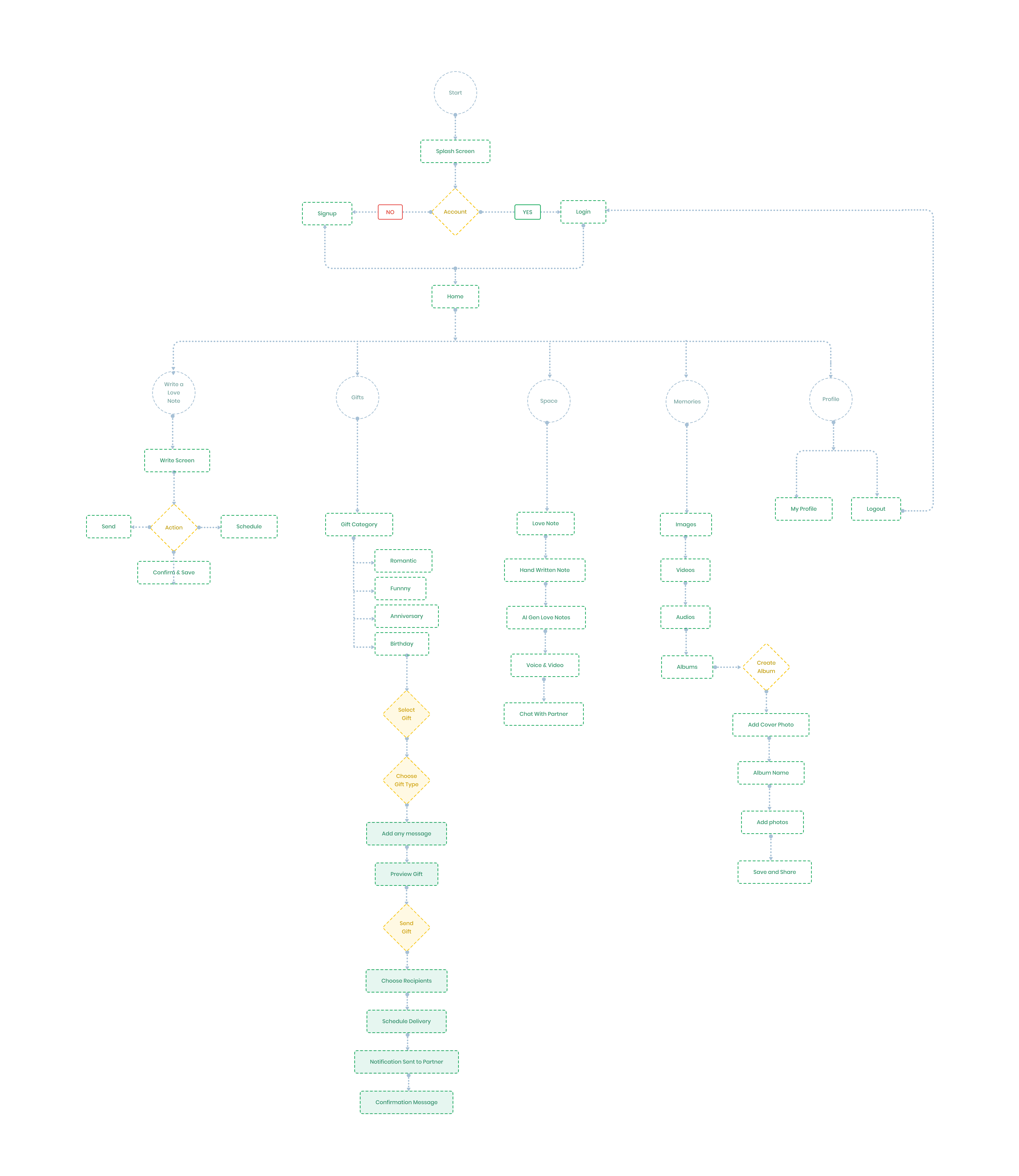 The user flow of VelNotes is designed to be simple and intuitive, allowing couples to easily connect and engage with each other. From signup to exploring meaningful features, the process ensures a smooth and personalized experience.