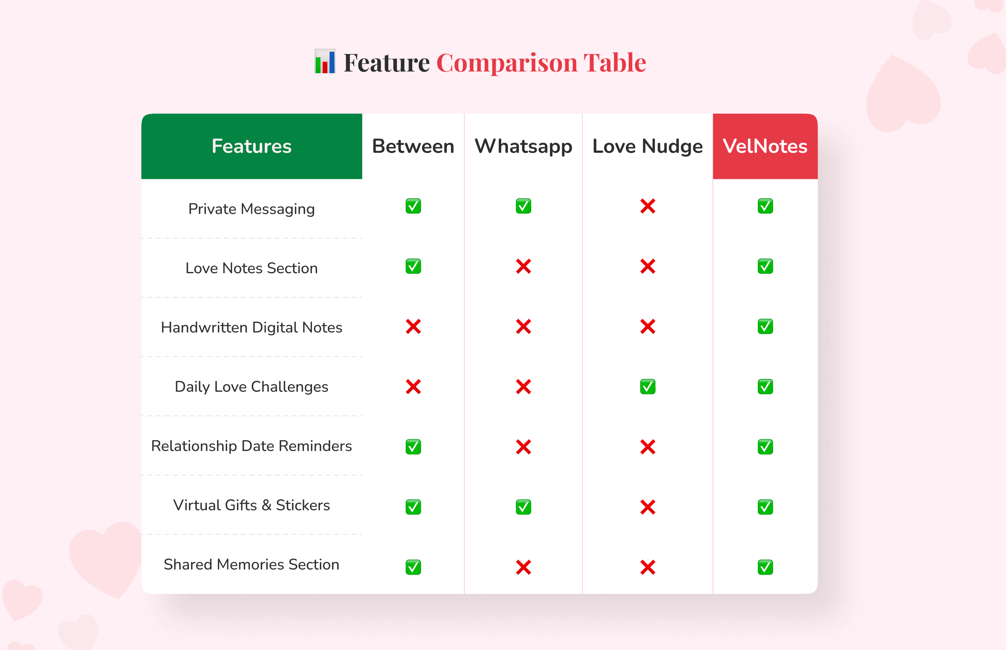 To create a unique and valuable experience for couples, I conducted a competitive analysis of three popular apps – Between, WhatsApp, and Love Nudge. This helped identify gaps and opportunities in the market, allowing me to refine VelNotes’ features to address unmet user needs and improve the overall user experience.